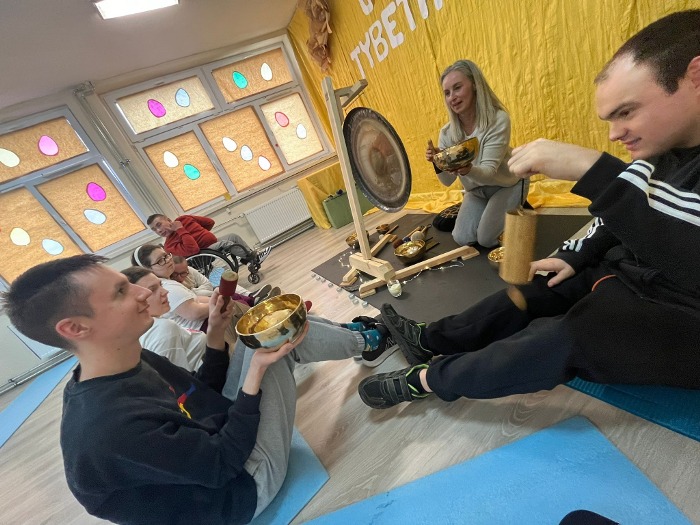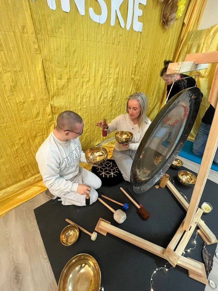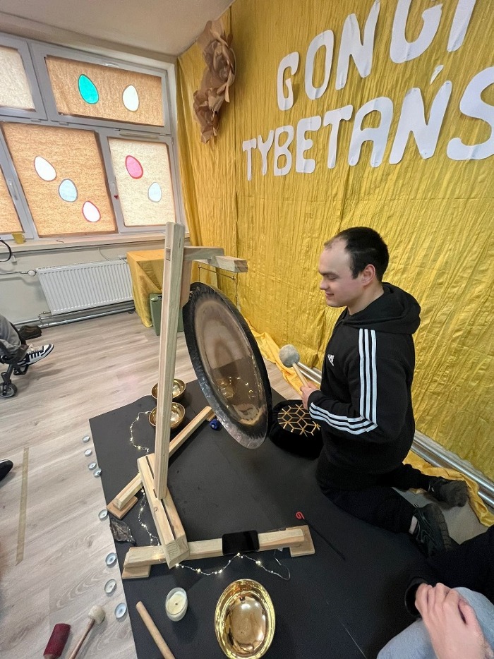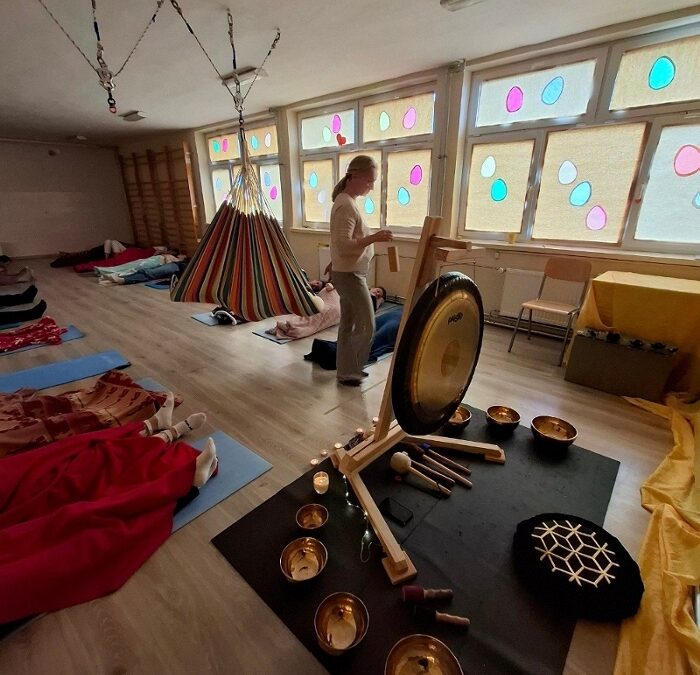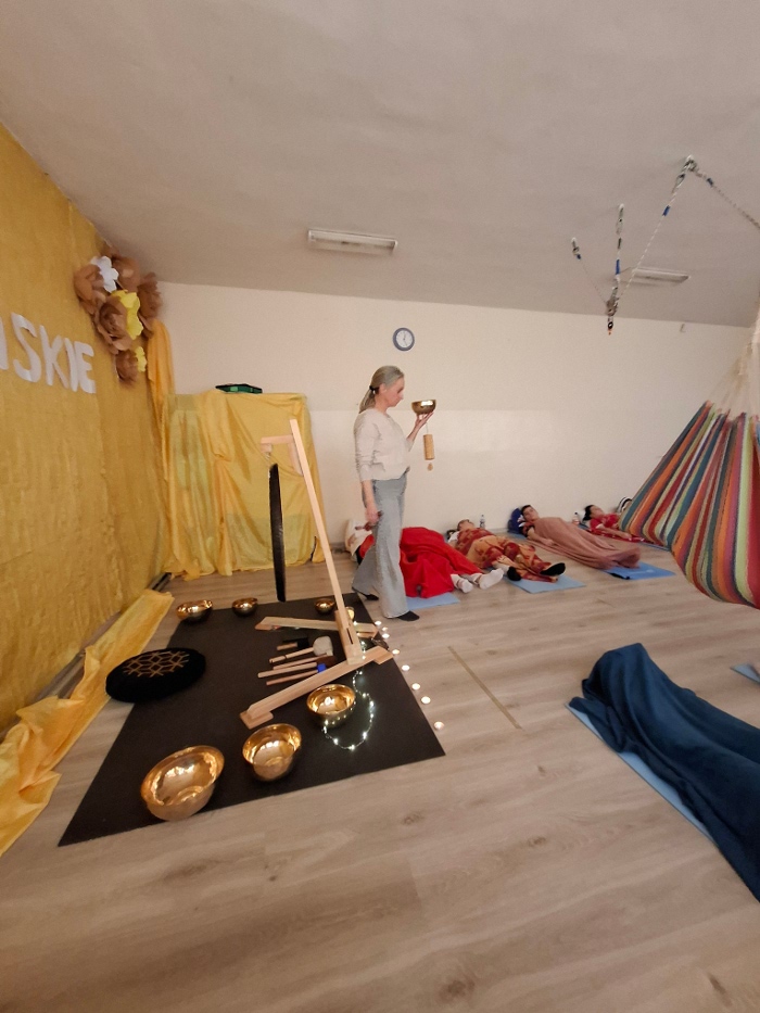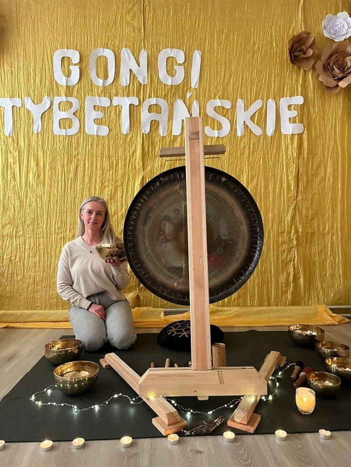 16 marca gościliśmy panią Kornelę Biernacką, która poprowadziła dla uczniów, rodziców i nauczycieli sesje z gongami tybetańskimi. Była to niezwykła okazja do poznania świata dźwięku i relaksu poprzez muzykę terapeutyczną. Uczestnicy mogli wsłuchać się w głębokie, kojące brzmienie gongów. Mieli również możliwość samodzielnie zagrać na instrumentach oraz doświadczyć różnych wrażeń dźwiękowych w bezpośrednim kontakcie z gongami.
